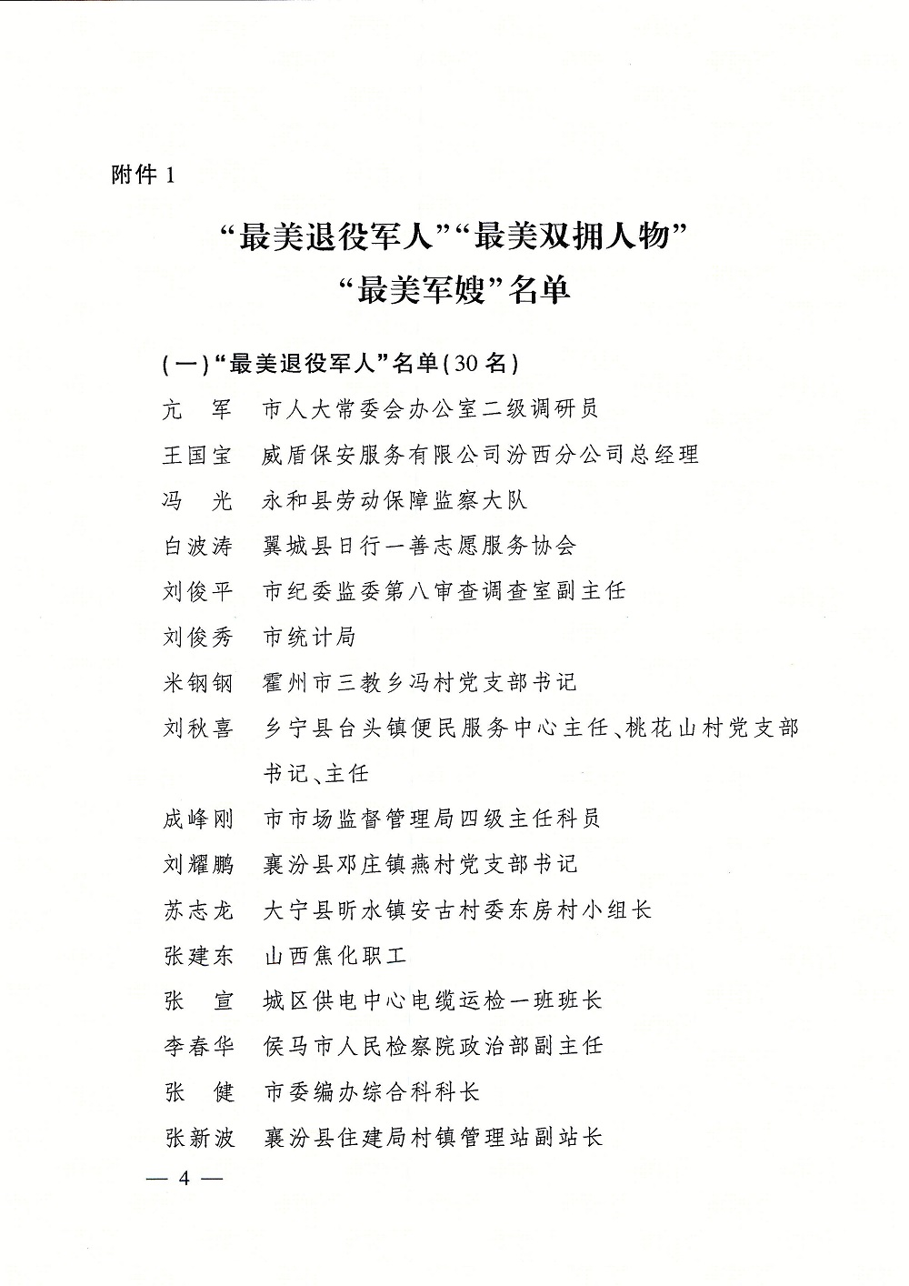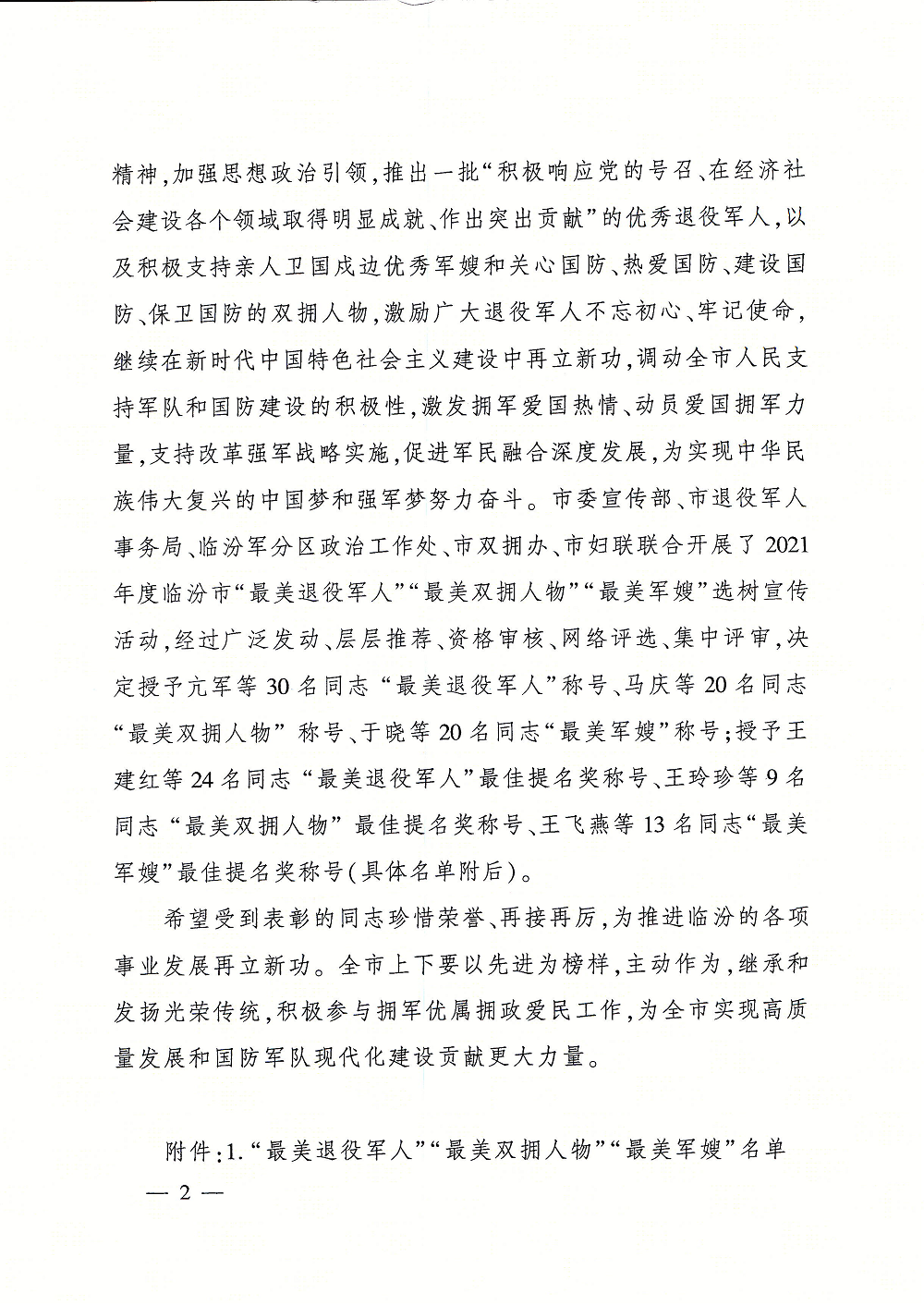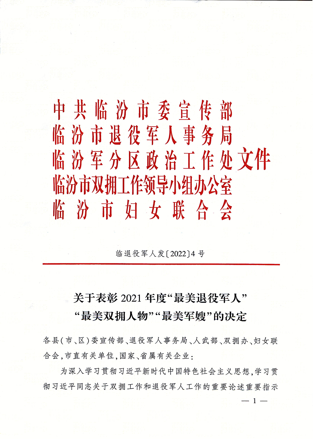 为深入学习贯彻习近平总书记关于退役军人及双拥工作的重要论述,全面落实省市党委政府有关双拥和退役军人工作决策部署,加强思想政治引领,推出一批积极响应党的号召、在经济社会建设各个领域取得明显成就、作出突出贡献的优秀退役军人,以及积极支持亲人卫国戍边优秀军嫂和关心国防、热爱国防、建设国防、保卫国防的双拥人物,发挥典型示范作用,在全社会营造拥军优属拥政爱民的浓厚氛围,2021年第四季度,中共临汾市委宣传部、市退役军人事务局、临汾军分区政治工作处、市双拥办、市妇联在全市组织开展了2021年度“最美退役军人”“最美双拥人物”“最美军嫂”选树宣传活动。
