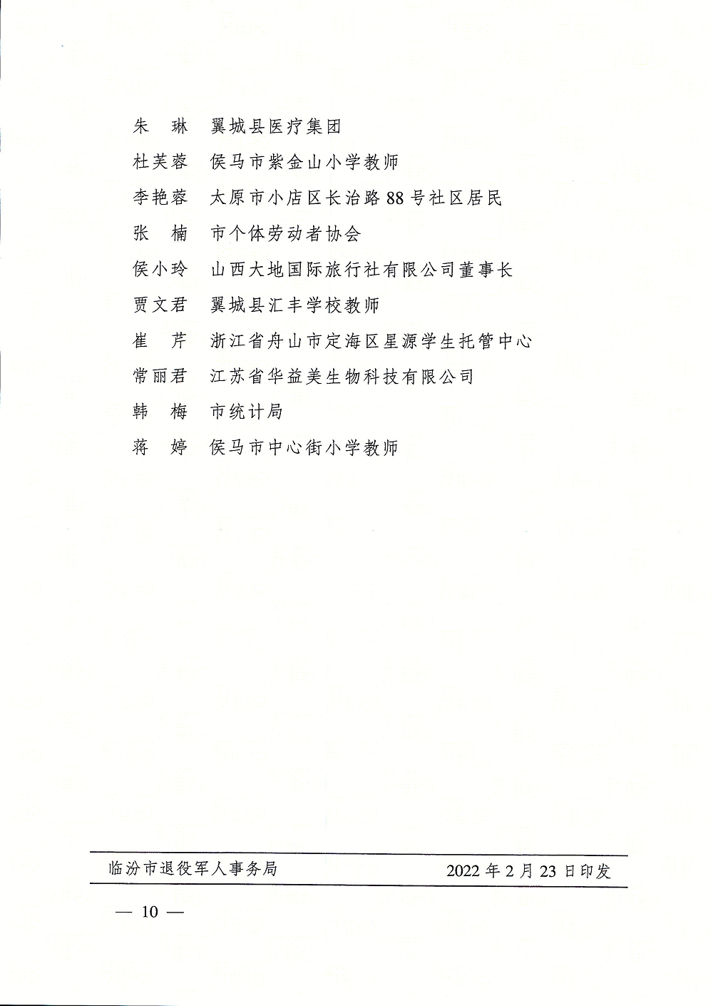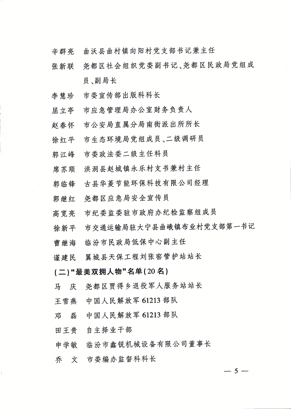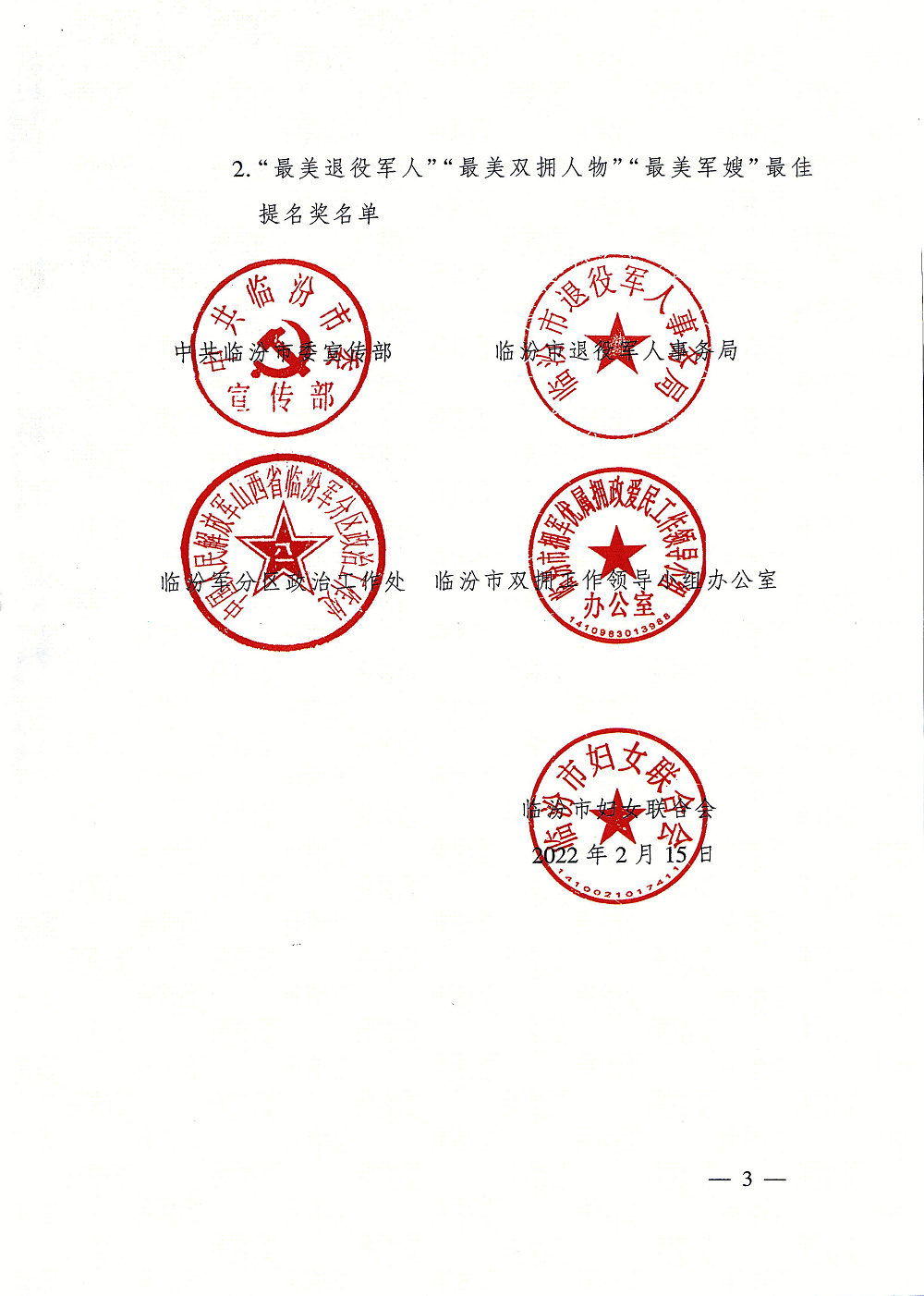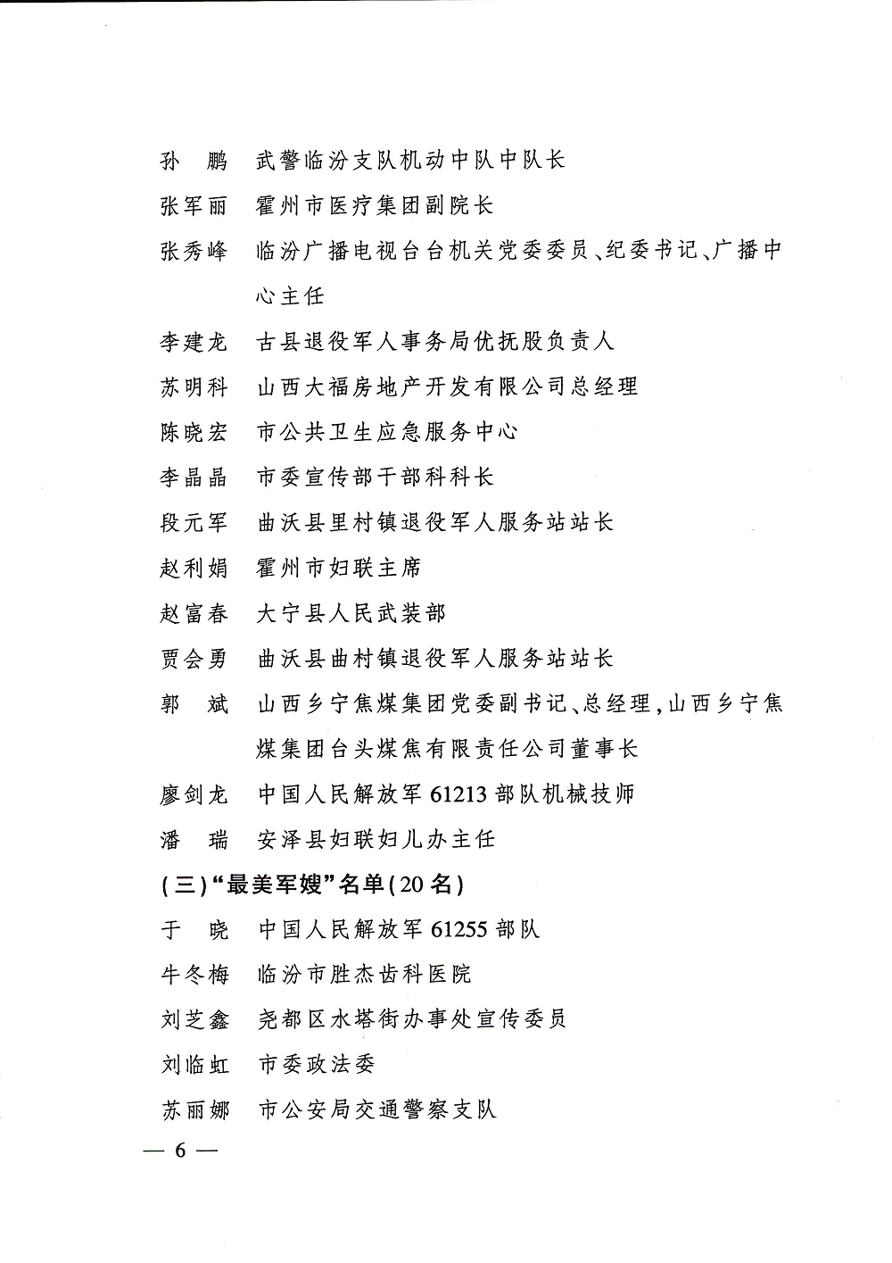 为深入学习贯彻习近平总书记关于退役军人及双拥工作的重要论述,全面落实省市党委政府有关双拥和退役军人工作决策部署,加强思想政治引领,推出一批积极响应党的号召、在经济社会建设各个领域取得明显成就、作出突出贡献的优秀退役军人,以及积极支持亲人卫国戍边优秀军嫂和关心国防、热爱国防、建设国防、保卫国防的双拥人物,发挥典型示范作用,在全社会营造拥军优属拥政爱民的浓厚氛围,2021年第四季度,中共临汾市委宣传部、市退役军人事务局、临汾军分区政治工作处、市双拥办、市妇联在全市组织开展了2021年度“最美退役军人”“最美双拥人物”“最美军嫂”选树宣传活动。