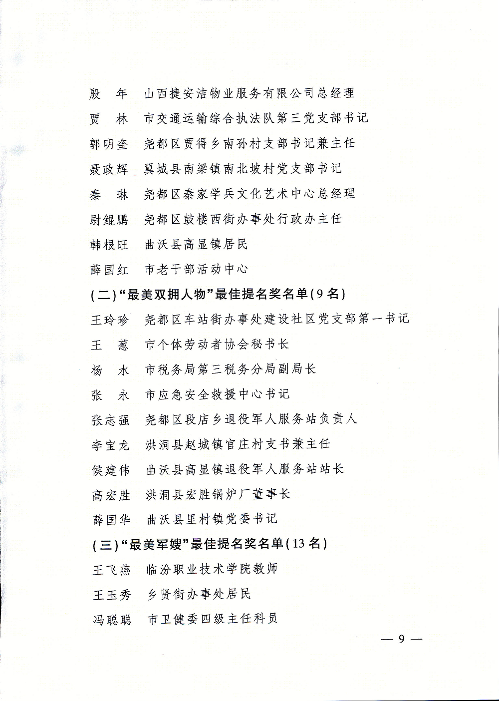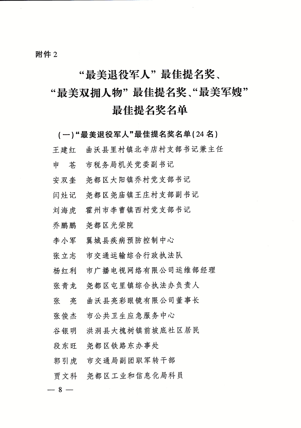 经过广泛发动、层层推荐、资格审核、网络评选、集中评审,决定授予亢军等30名同志 “最美退役军人”称号,马庆等20名同志 “最美双拥人物” 称号,于晓等20名同志“最美军嫂”称号;授予王建红等24名同志 “最美退役军人”最佳提名奖称号、王玲珍等9名同志 “最美双拥人物” 最佳提名奖称号、王飞燕等13名同志“最美军嫂”最佳提名奖称号。